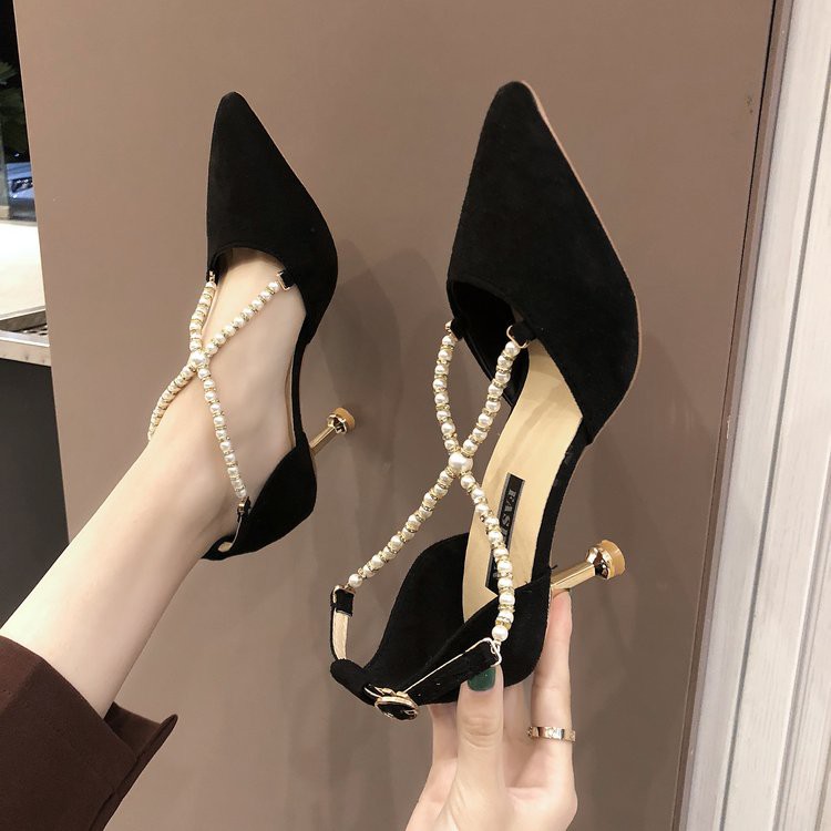2019 Baru Elegan Mutiara Gesper Logam Sepatu Hak Tinggi Wanita Sandal Korea Fashion Lembut Sutra Menunjuk Wanita Sepatu Sandal Pesta Dangkal Wanita Sandal Aliexpress
