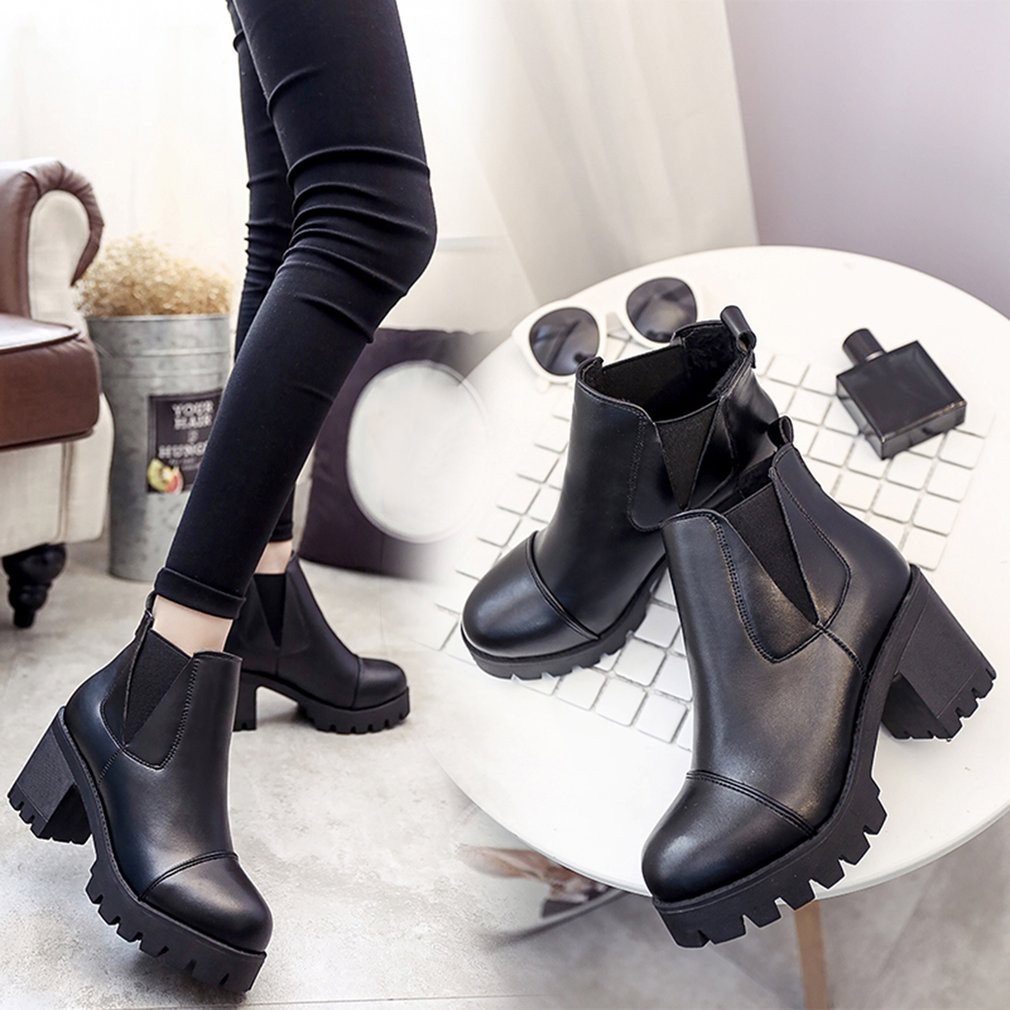 Bayar Di Tempat Sepatu Boots Martin Ankle Mid Block Heels Platform Warna Hitam Polos Untuk Wanita Shopee Indonesia