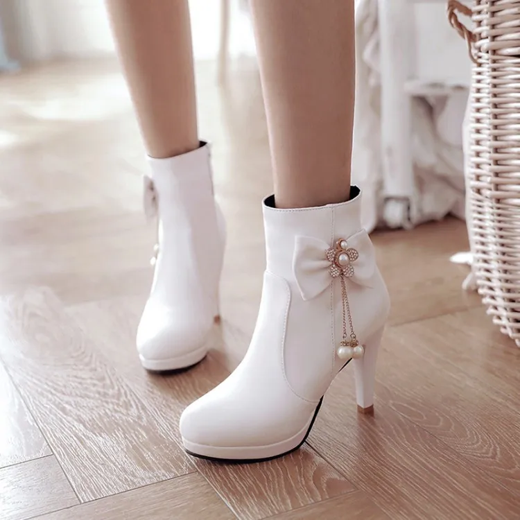Pxelena New 4 Color Sweet Ladies Ankle Boots White Pink Black Stiletto High Heels Fashion Boots Women Shoes Butterfly Knot Beads Ankle Boots Aliexpress